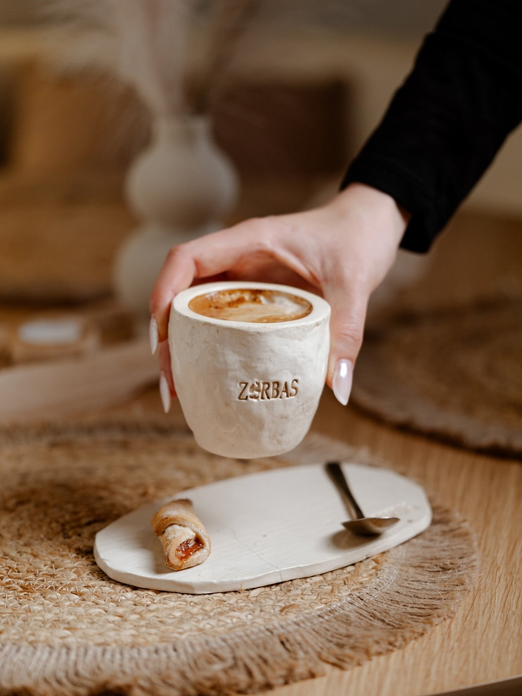 Detaliul sculptural al mânerului perforat îi adaugă personalitate, iar lingurița asortată, modelată și glazurată manual, completează perfect ansamblul. Este o piesă creată să aducă bucurie în ritualurile zilnice și să reamintească frumusețea gesturilor simple.